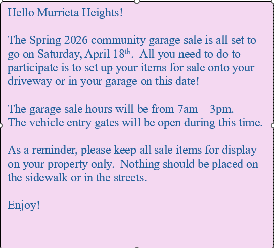 Home / Management / Manager’s Messages Manager’s Messages Murrieta Heights Community Garage Sale! March 26, 2026 / bwood